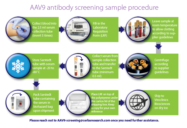 (1 sample = 1 patient = 1 LRF). In case you are shipping multiple serum samples, please inform Cerba Research by sending an email to AAV9-Screening@cerbaresearch.com
